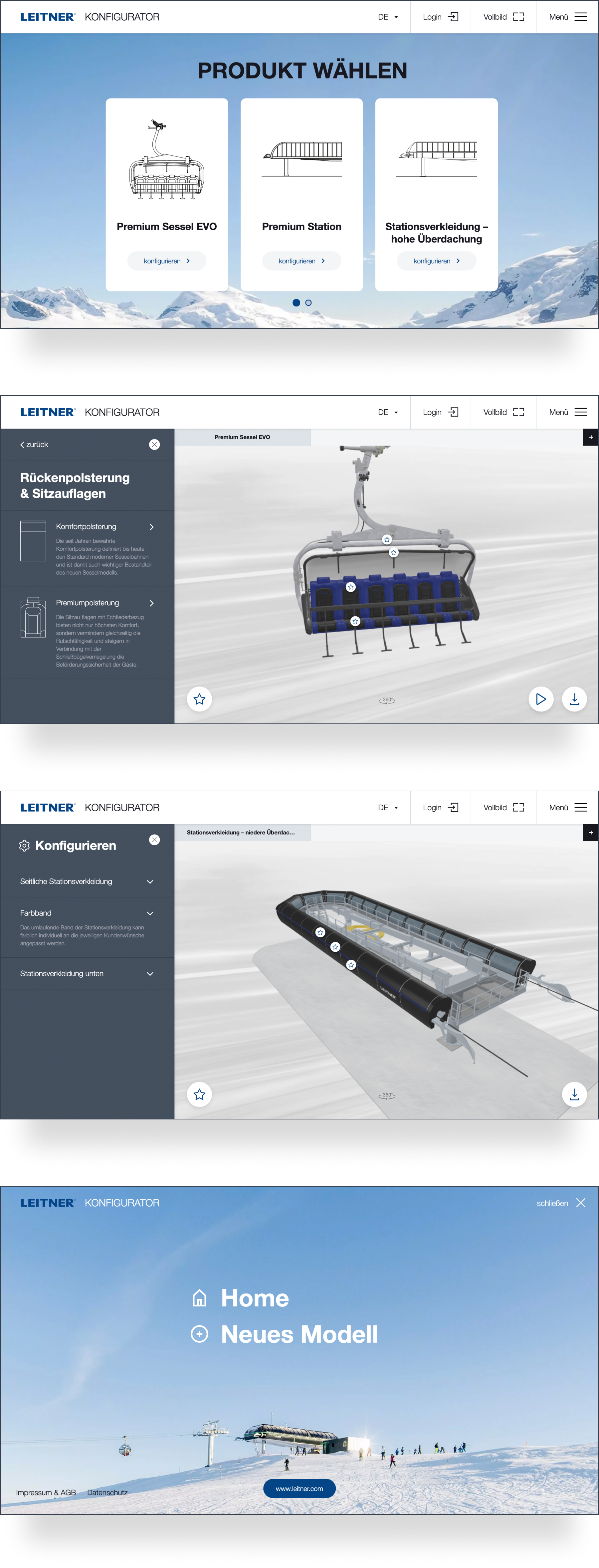 Ganz intuitiv weiß der Kunde was ihn zum Ziel führt – seiner individuell gestalteten Seilbahn. Wir haben die Benutzerführung sehr flüssig gestaltet und mit Animationen versehen, sodass die Interaktionszeit ausgedehnt wird und die Benutzer sich ausführlich mit den Produkten beschäftigen.