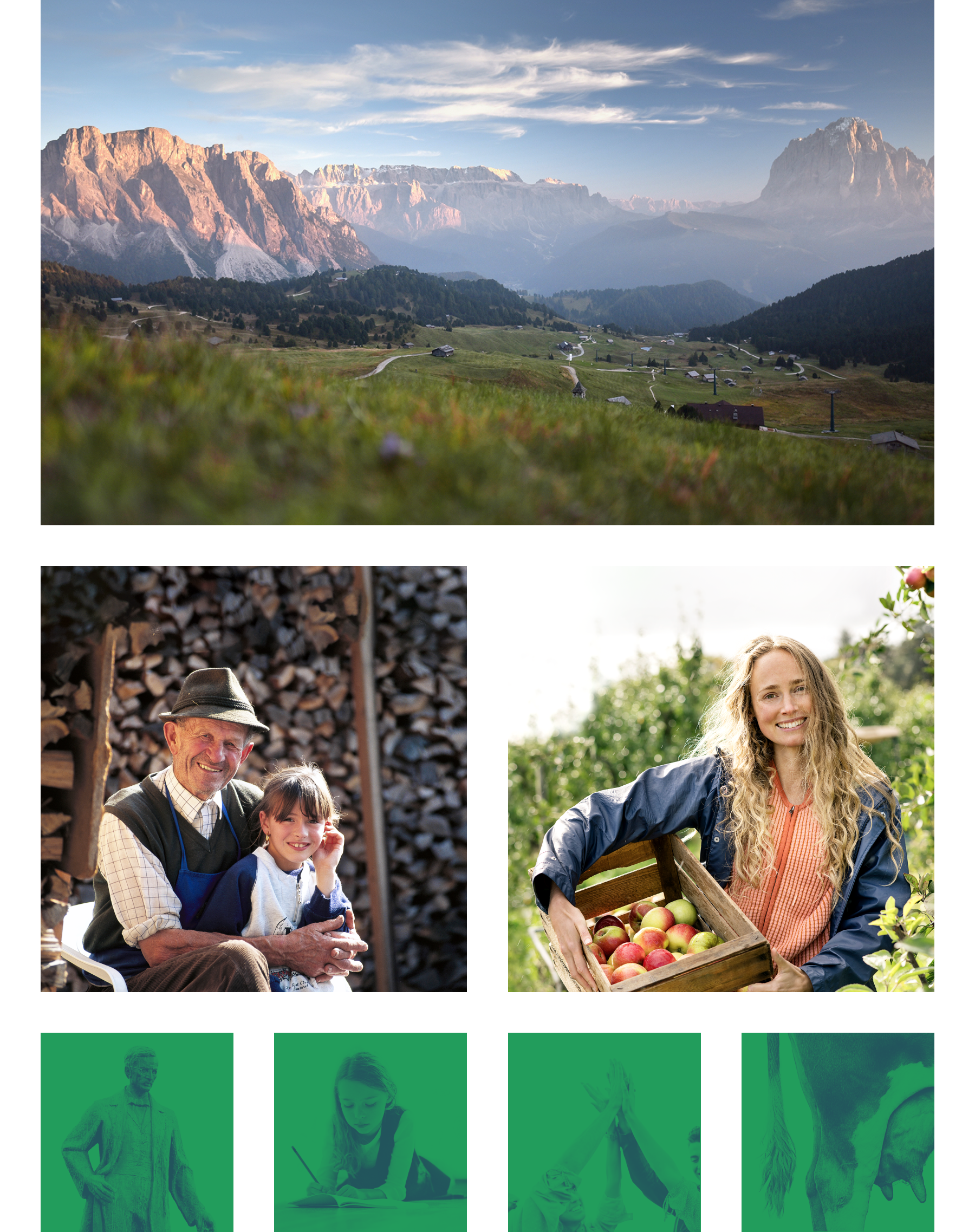Die Bilderwelt: Der Mensch steht im Mittelpunkt und ist zentrales Element in der Bildthematik. Damit werden Nähe und Bedeutung (Relevanz) des RVS mit der jeweiligen Anspruchsgruppe respektive Persona hergestellt. Die Persona ist Teil des Bildes und wird in einer Kontakt- bzw. in einer Touchpoint-Siutation mit der Genossenschaft bzw. dem Raiffeisenverband Südtirol gezeigt.